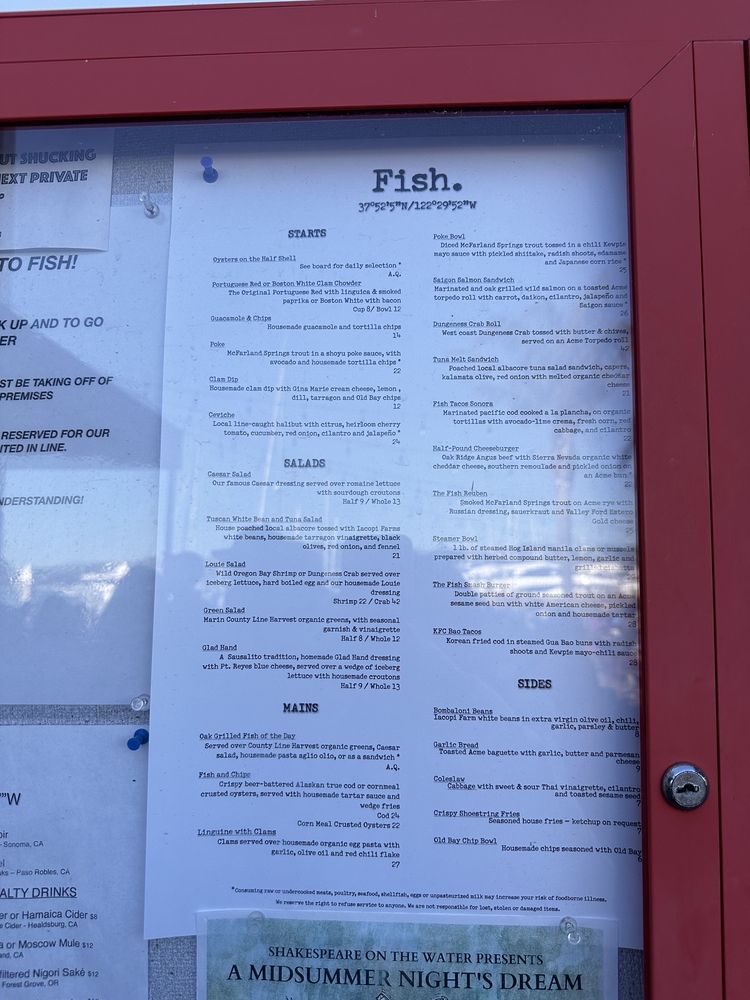 Fish Restaurant, located in Sausalito, CA, offers a delightful seafood dining experience with its fresh and flavorful dishes. The casual ambiance, outdoor seating overlooking the water, and friendly service make it a perfect spot for a post-hike meal or a relaxing lunch. The menu features highlights such as the Fish & Chips, Crab Roll, Tomato Clam Chowder, Queso Fundido with Homemade Octopus Chorizo, and Oysters.